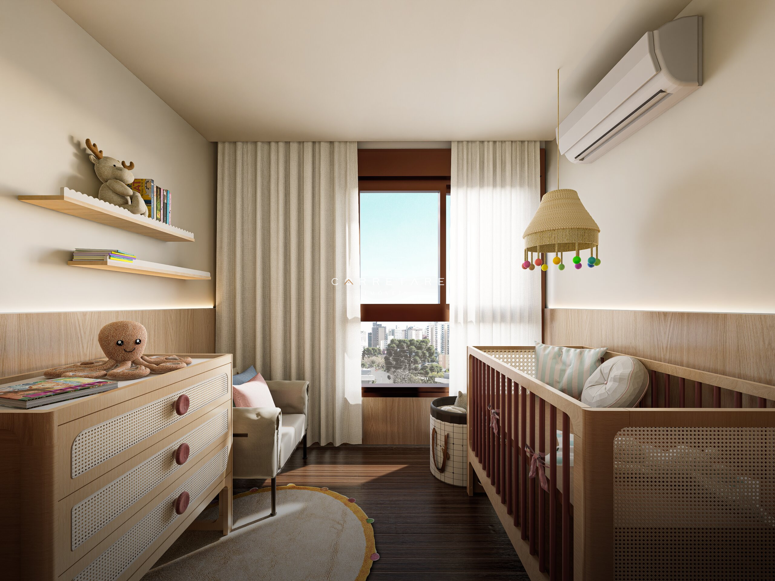 Persianas motorizadas nos quartos.