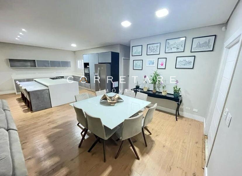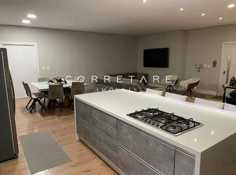 A sala de estar e jantar são amplas e integradas à cozinha gourmet planejada, com ilha central, bancadas em quartzo e armários sob medida, formando um espaço ideal para convivência e recepções.