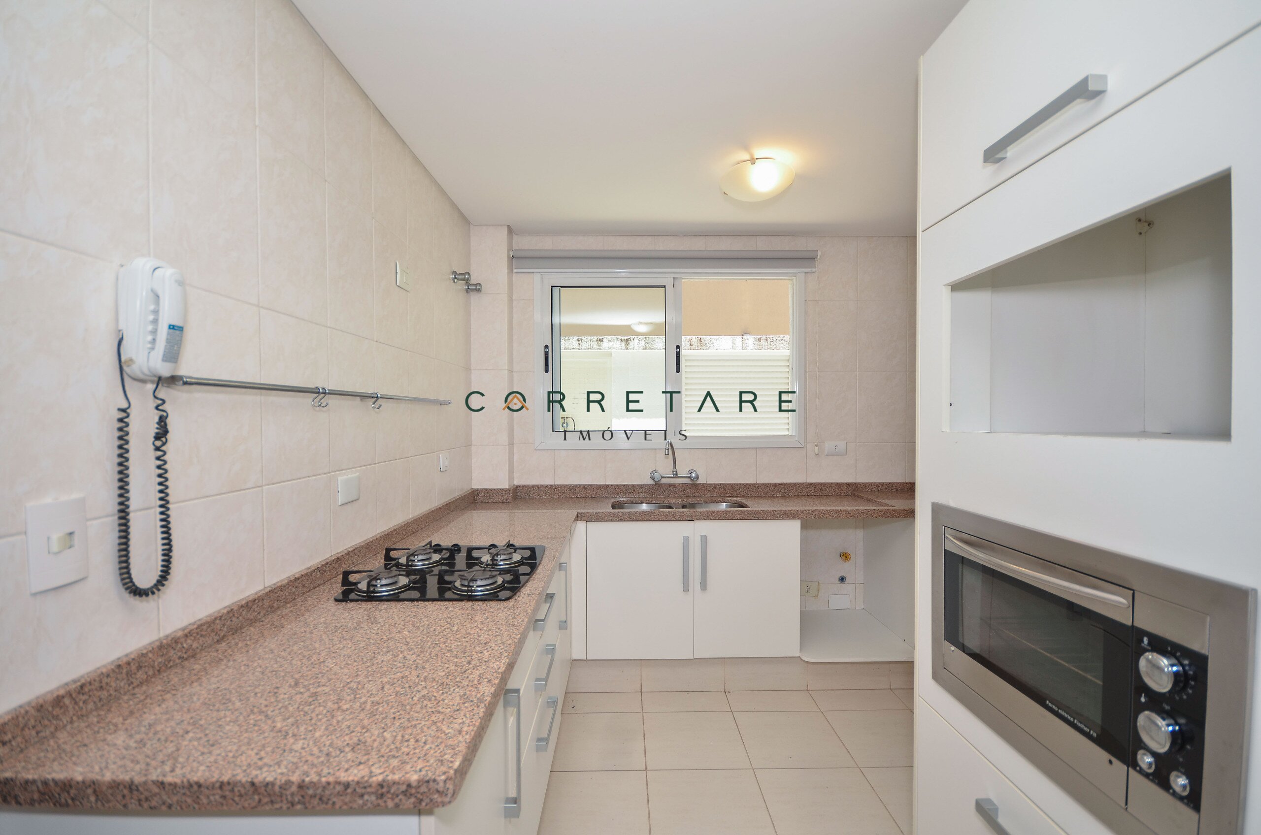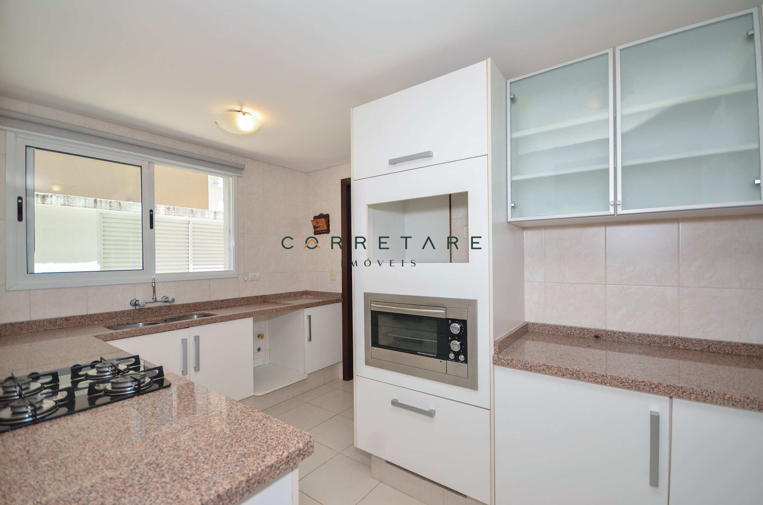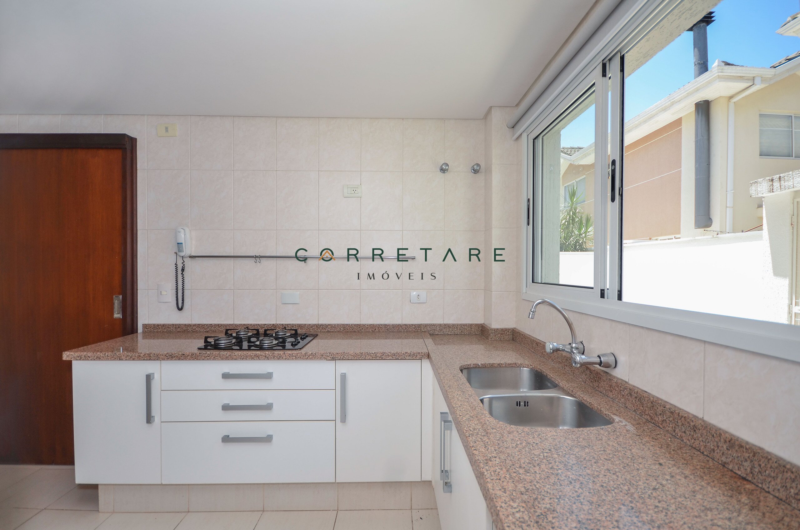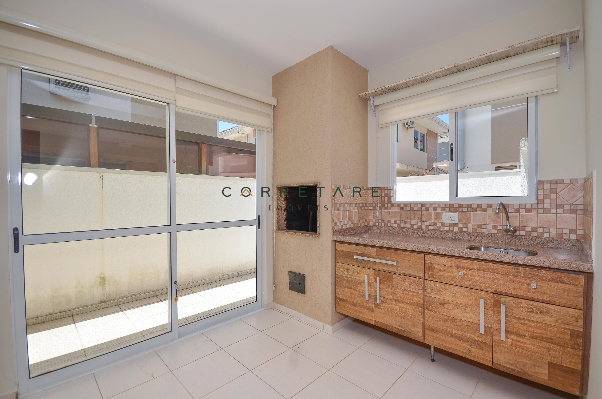 A cozinha além de prática e funcional, tem acesso direto ao espaço gourmet com churrasqueira a carvão.