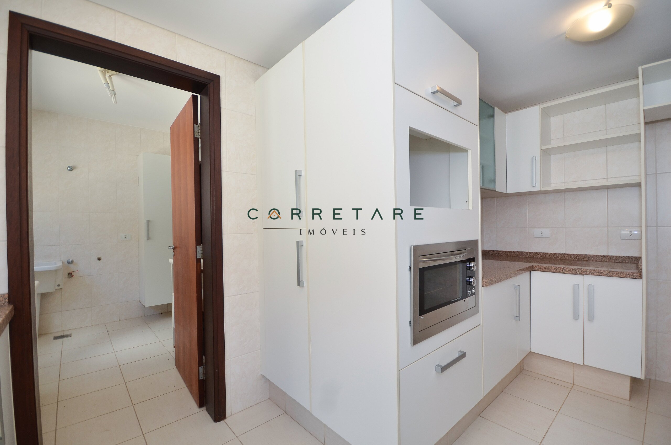 Ao lado a arejada lavanderia conta com armários sob medida e banheiro.