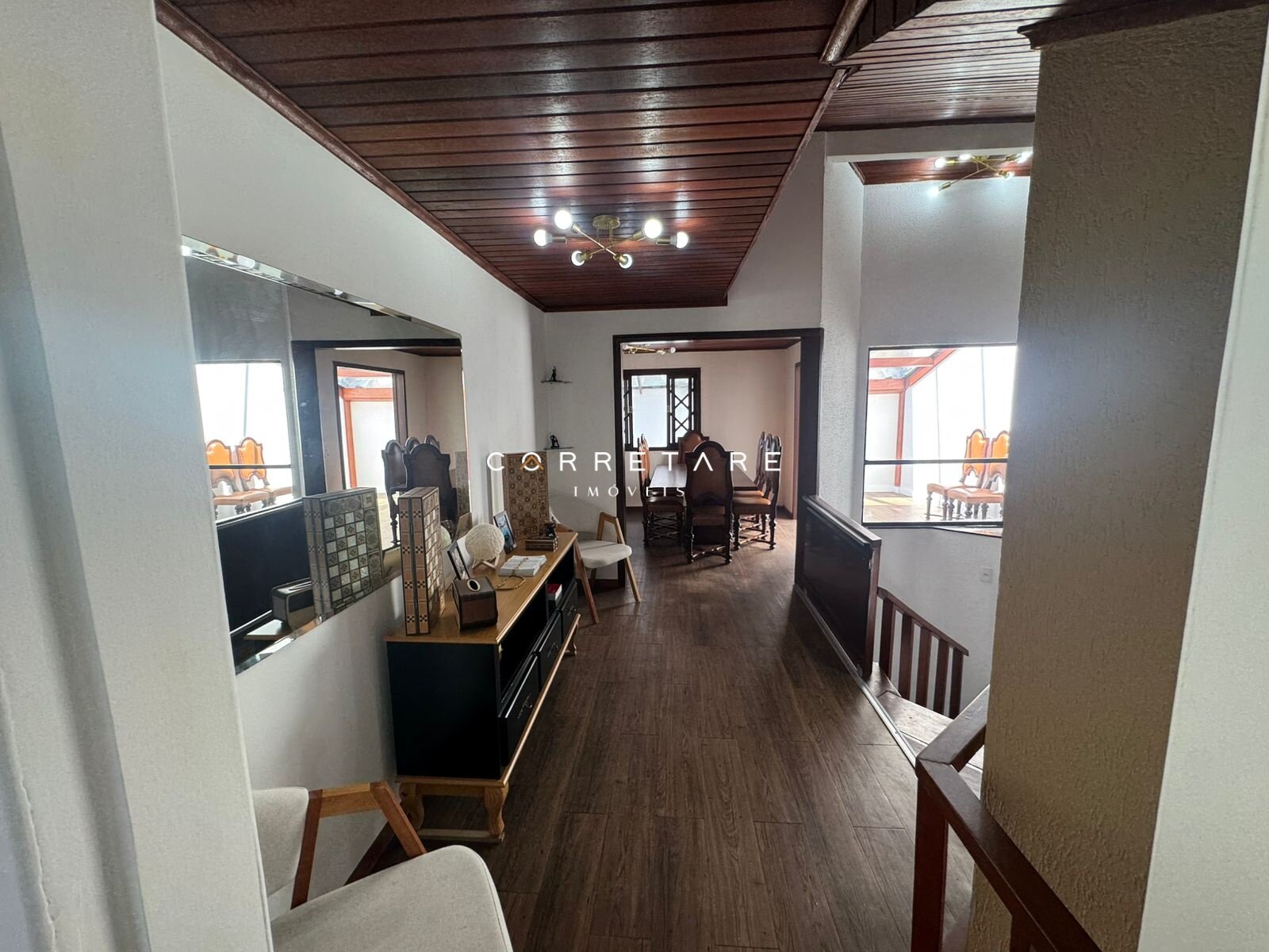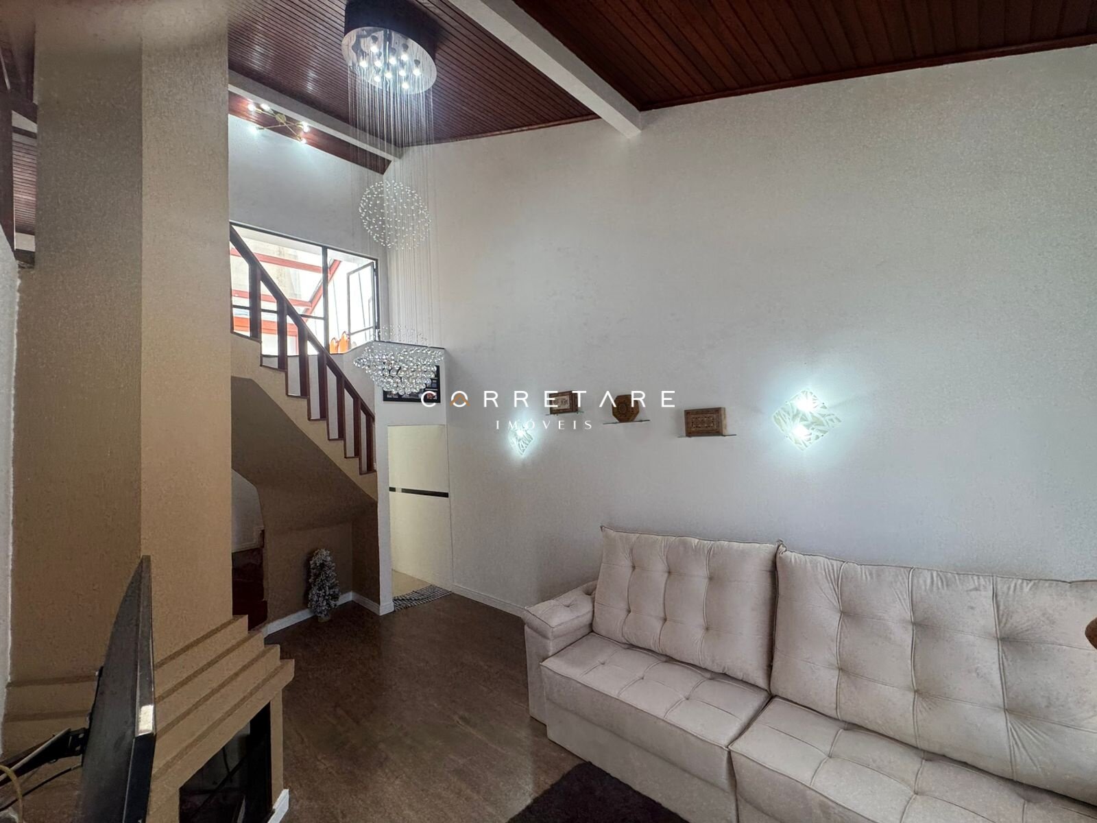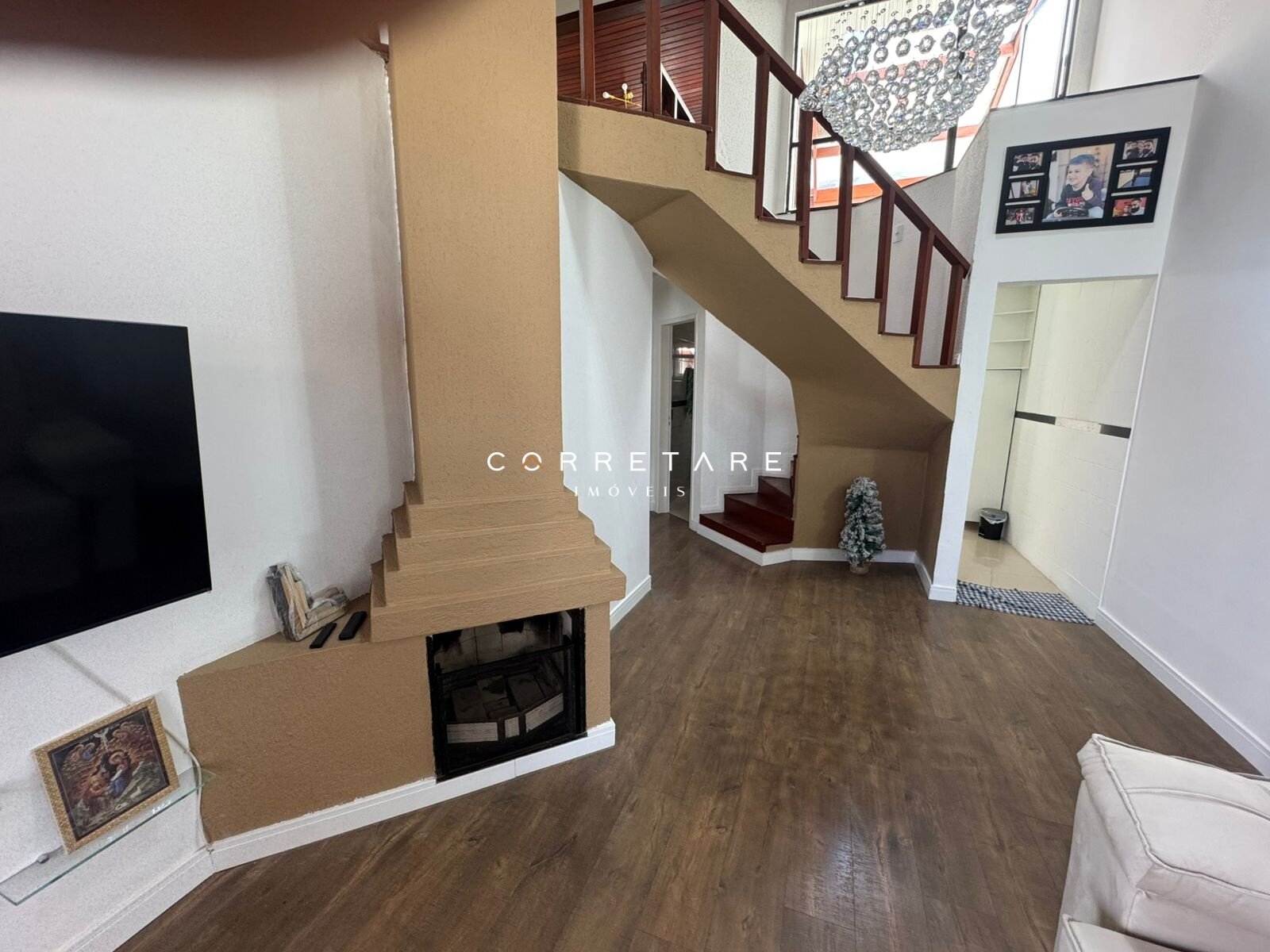 No pavimento térreo, o sobrado conta com uma sala ampla e integrada, com pé-direito alto, excelente iluminação natural e lareira, trazendo aconchego ao ambiente. A cozinha é totalmente equipada, prática e moderna. Ainda neste piso, o imóvel oferece dois quartos térreos, garantindo acessibilidade e comodidade para o dia a dia.