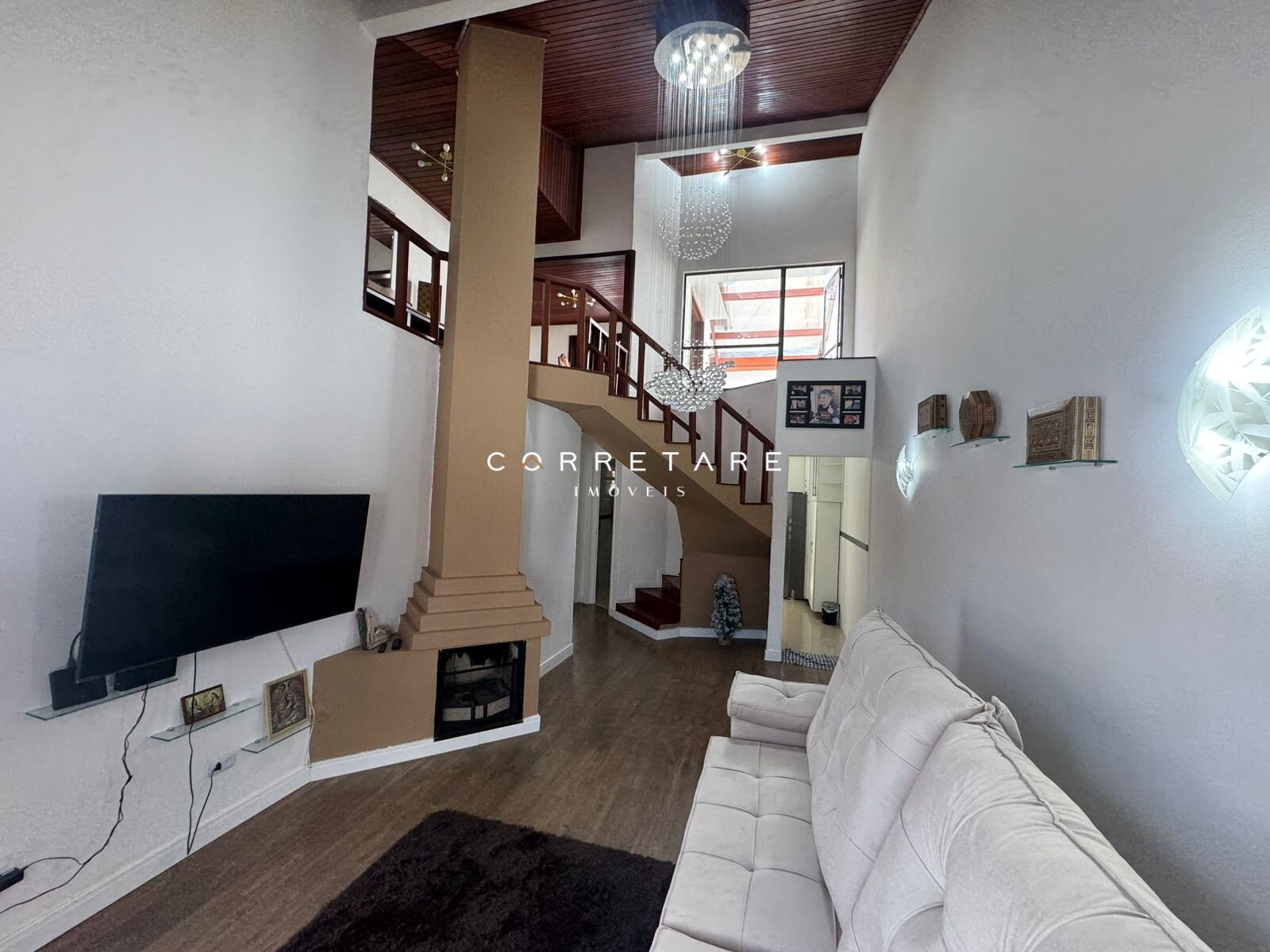 Sala com pé-direito alto e lareira